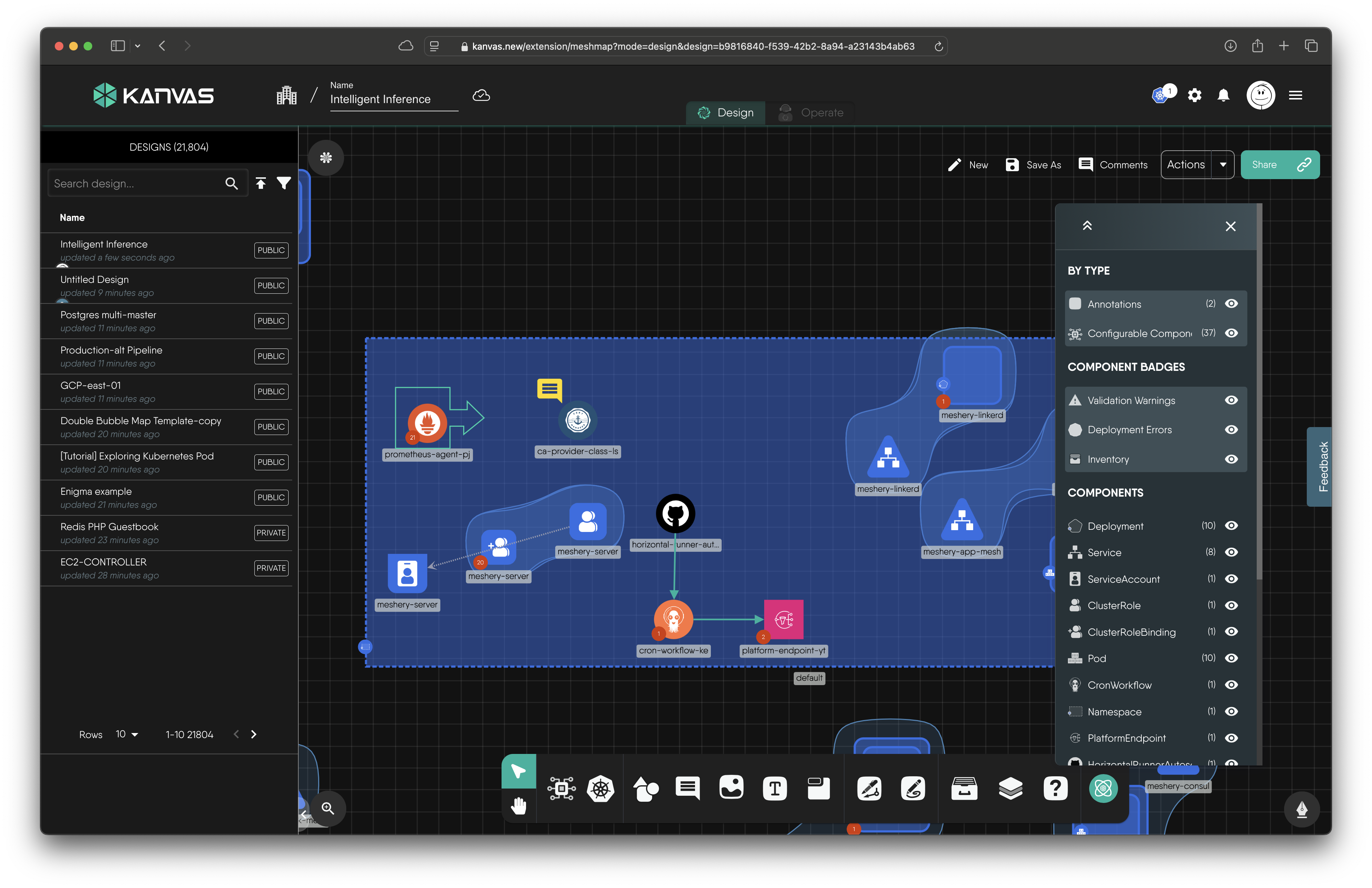 Kanvas is a web-based, enterprise-grade collaboration platform that allows platform, operations, and development teams to create, review, and operate highly-detailed architecture diagrams of their cloud and cloud native infrastructure. Kanvas is the definitive tool for productive, collaborative infrastructure management. Learn more about Kanvas at https://layer5.io/kanvas.